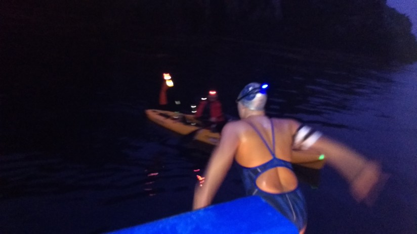 I jumped off the boat into the clear water, just off the island. Neil was waiting for me in the kayak and Dawn flashed a light on the point I needed to touch to start my swim. It was still fairly dark and I had my daytime/darker goggles on. I found swimming the 25 meters in the near dark, through the kelp beds to be one of the most terrifying minutes of my life. I’m only partly kidding. 🙂 But, I found the spot, touched the rock and we were off.