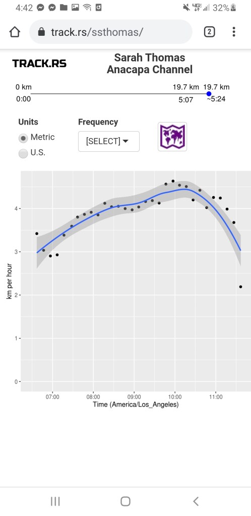 As I came off the island, I was pushing hard. Trying to stay loose, make sure nothing hurt, but still trying to set a hard pace. At the 1 hour mark, during my feed, Neil was giving me my stats: stroke rate, distance traveled, etc. Hmm. Not great news. I knew I was swimming hard- thinking about all the guys back home urging me to go out fast. At the 90 minute mark, the same, with the additional news: You’ve got a current coming at you at your 2 o’clock. You’re only going 2 miles an hour, you need to hit 1 mile in under half an hour if you want to get this record. At the 2 hour mark, I was told: That was better, but you need to be 27 minutes/mile if you want any chance to catch up to the record. At the 3 hour mark: You’re definitely out of the current and catching back up. The kicking is helping. Stroke rate is still 77. We flew by Gina- I couldn’t remember how far out she was- but I barely paid her any attention. Neil assured me I was on pace, the currents were behaving for the time being and if I kept working, I was still on pace. At the 4:30 mark, exactly what I was hoping to hear: If you feel strong, this is your last feed. You have to keep kicking hard to get there- it’s going to be close.