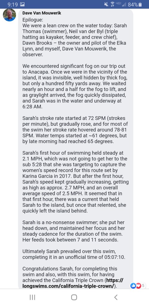 It was such a beautiful stretch of water. I can assure you, I’ll be back. I was happy to finish off my California Triple Crown (Catalina, Tahoe, and one of the Santa Barbara Channel Islands). I also really do recommend this swim as a great lead up to the English Channel.
